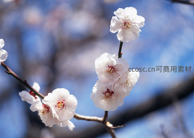 通过微距镜头捕捉到的几朵淡粉色梅花,花瓣细腻柔软,花蕊清晰可见,在柔和的光线下显得格外娇艳动人,充满春日气息。