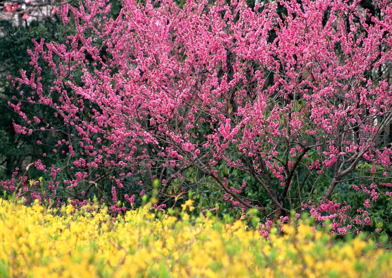 粉红花海与金黄迎春交织的春景