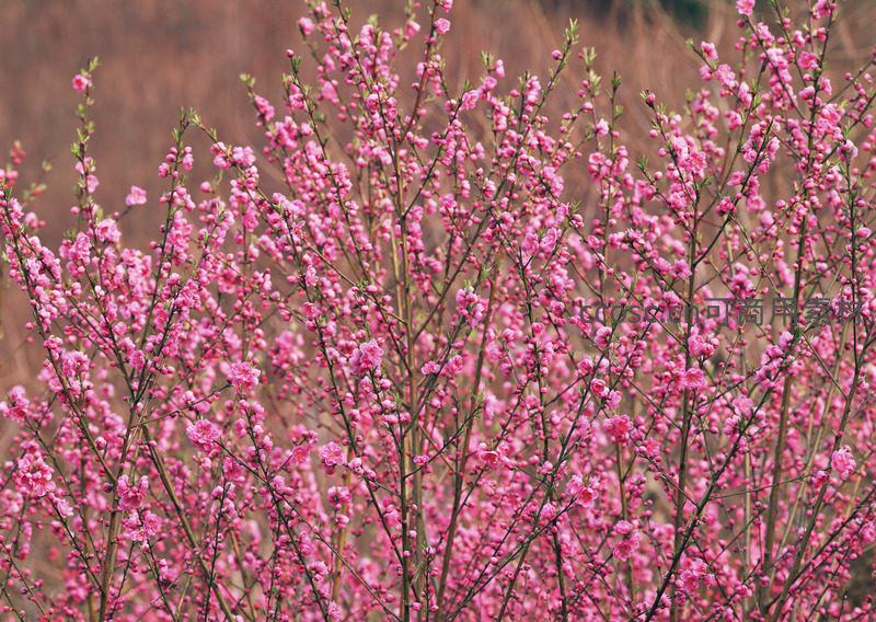 无数粉嫩的桃花密布在枝头,形成一片浪漫的粉色海洋,背景是朦胧的田野,展现了春天里桃树盛放时的蓬勃生命力与诗意氛围。