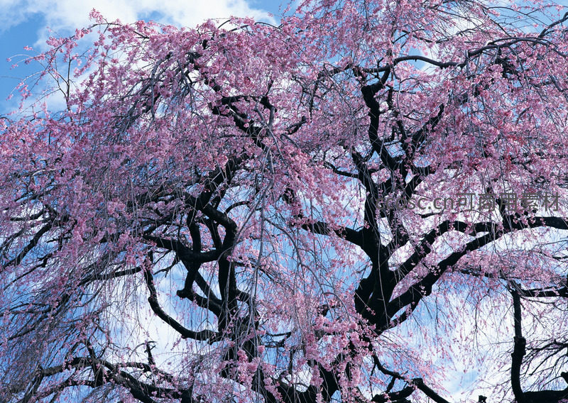 一棵盛开的垂枝樱在晴朗蓝天下舒展枝条,粉嫩花朵如云霞般覆盖树冠,展现春季自然生机与诗意美感。