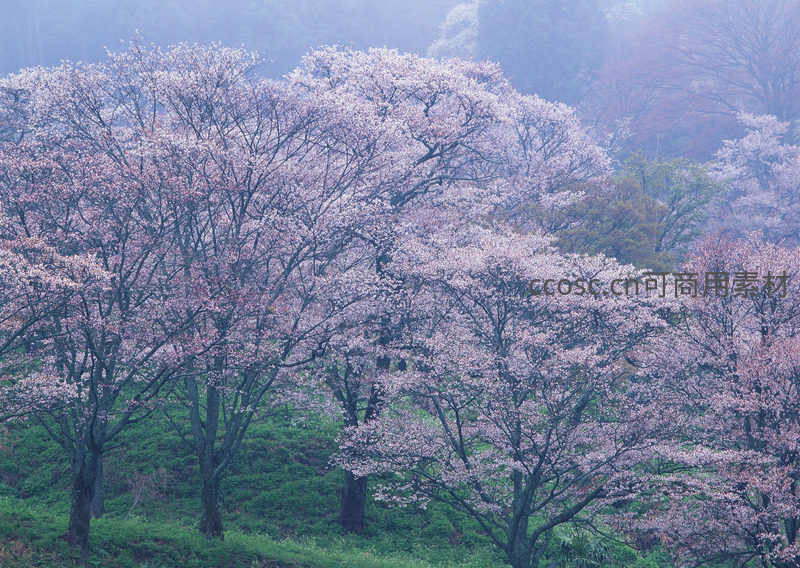 薄雾笼罩的山坡上,成片樱花树竞相开放,淡粉色花海与青翠草地交织,营造出朦胧梦幻的春日山野意境。
