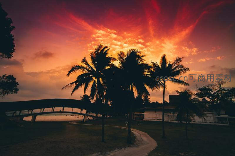 火红的晚霞如燃烧般布满天际,椰树与拱桥的剪影倒映在宁静的水面上,蜿蜒的小径引领视线,构成一幅诗意的黄昏画卷。