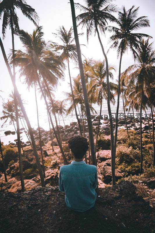 一位旅人背对镜头,静坐在椰林环绕的海岸边,远眺波光粼粼的大海,享受着热带岛屿独有的宁静与惬意。