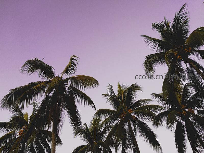 紫霞满天时,椰树剪影勾勒热带黄昏美景