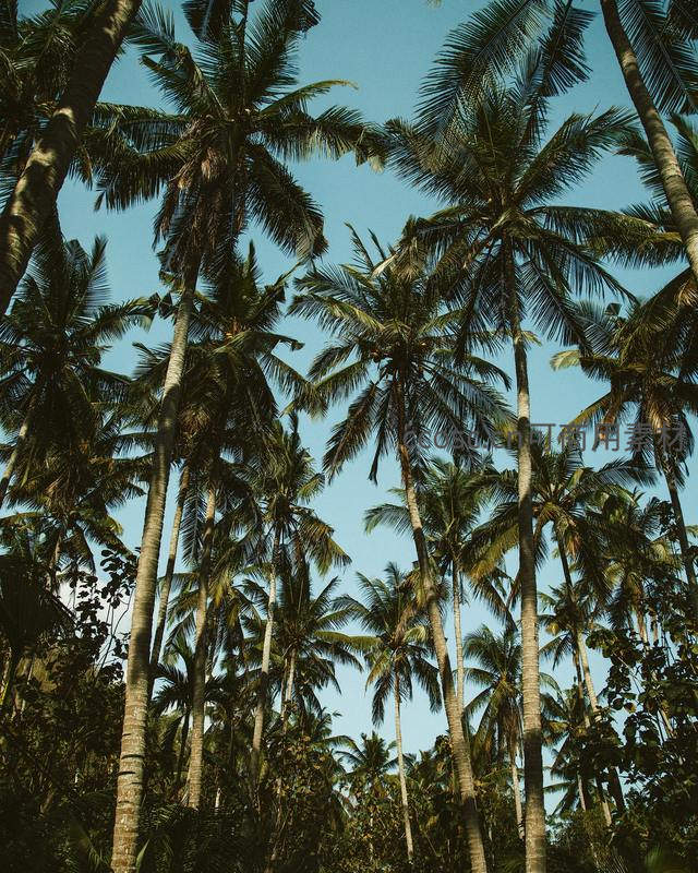 从地面仰望,成片的椰子树直插云霄,浓密的树冠交织成一片绿色天幕,阳光透过缝隙洒下斑驳光影。