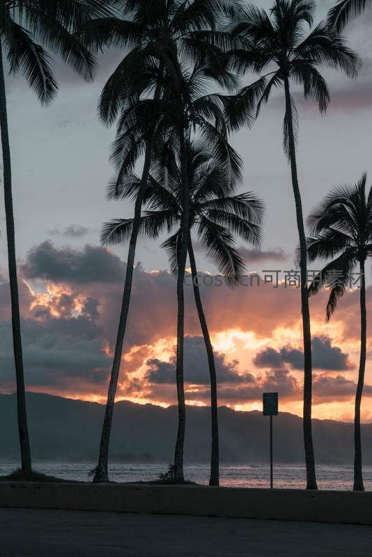 夕阳西下,火红的云霞铺满天际,高耸的椰树剪影矗立在海边,远方山峦与大海相接,构成一幅壮阔的黄昏海景图。