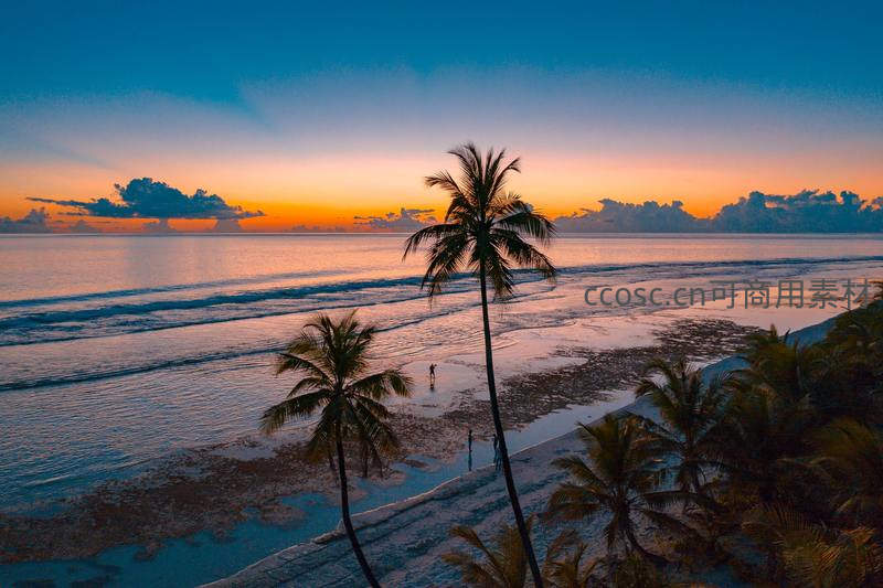 金色夕阳洒满海面,椰树剪影勾勒出热带风情,波光粼粼的海水与绚烂云霞交织,营造出浪漫而宁静的黄昏氛围。