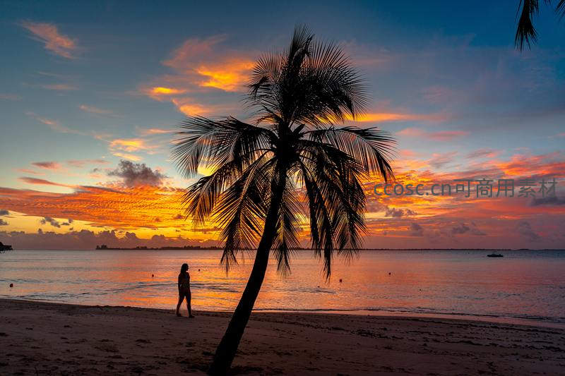 一棵倾斜的椰树在绚烂晚霞下投下长长剪影,一人缓步于沙滩之上,享受着这份独属于黄昏的温柔、宁静与诗意。