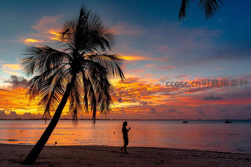 在绚烂的晚霞映衬下,一位女子漫步于热带沙滩,身旁椰树如画,远处海天一色,尽显悠闲与浪漫。