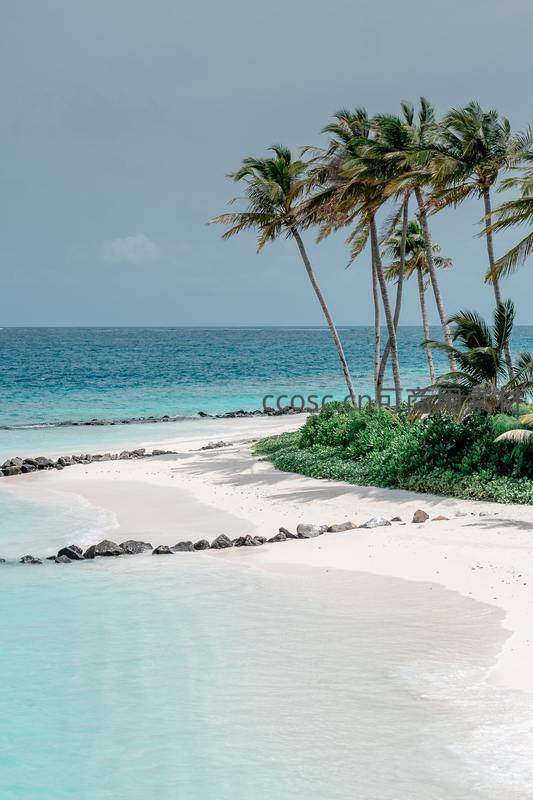 蜿蜒的白色沙滩被翠绿椰林环抱,清澈浅水温柔拍岸,构成一幅远离喧嚣、充满生机的热带海岸画卷。