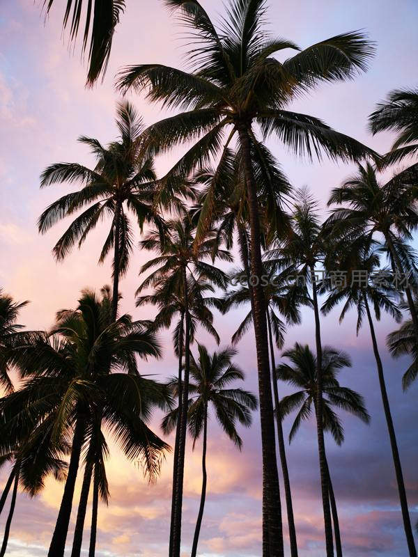 多棵椰子树密集矗立,枝叶在绚烂的晚霞中舒展,共同构成一幅充满热带气息与温柔暮色的自然画卷。