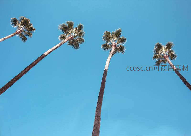 从低角度仰视拍摄,四棵挺拔的棕榈树直指纯净无瑕的蔚蓝天空,简洁的构图和明快的色彩传递出夏日的清爽与活力。