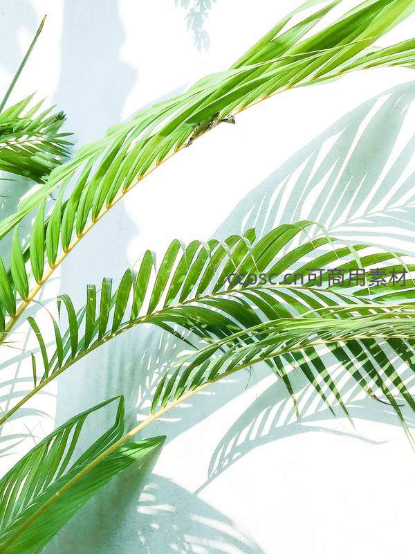 阳光透过翠绿的棕榈叶,在洁白的墙面上投下斑驳的影子,叶片脉络清晰可见,呈现出充满生命力的清新与静谧之美。