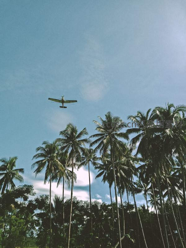 飞机掠过椰林上空,蓝天白云好风景