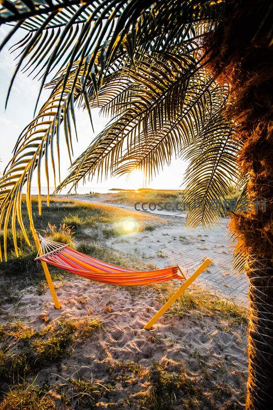 沙滩吊床伴夕阳,椰影婆娑享悠闲