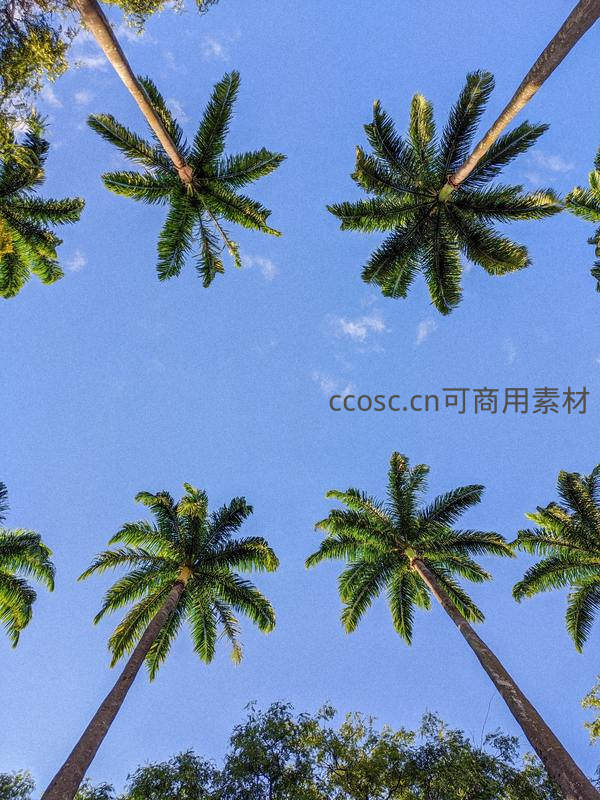 从地面仰视高耸入云的棕榈树,翠绿的叶片在湛蓝天空下舒展,构成一幅充满生机与宁静感的热带自然画卷。