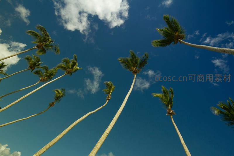 以仰视视角捕捉数棵高大椰树直指蔚蓝天空,洁白云朵点缀其间,画面充满生机与开阔感,是典型的热带海岛风情写照。