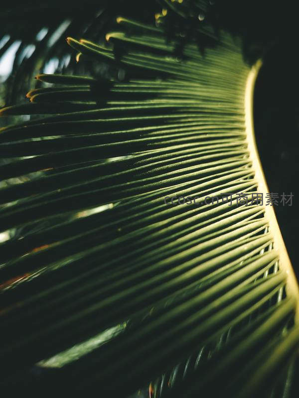 近距离捕捉棕榈叶片的精细纹理,在明暗对比下凸显其独特的线条美感与自然造物的精妙结构。