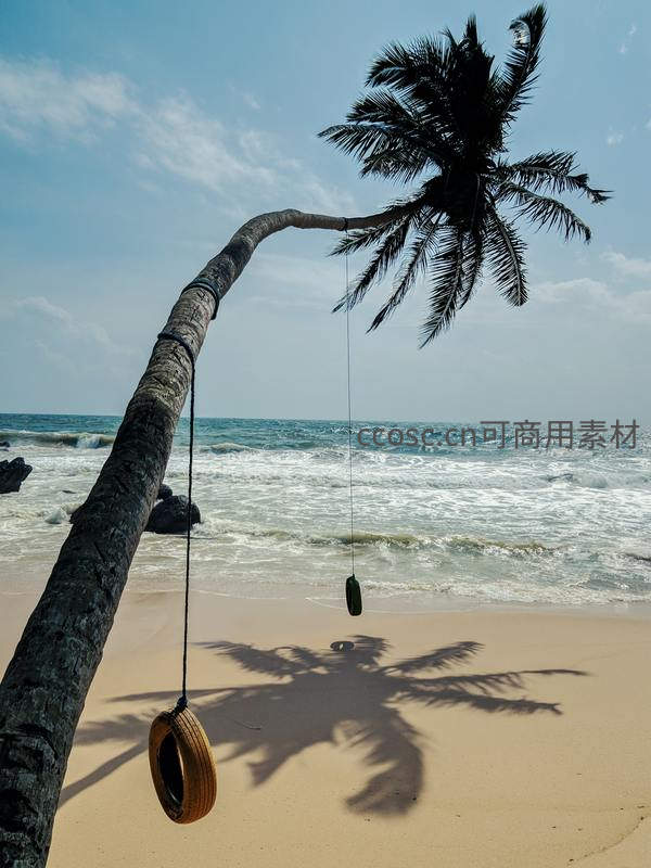 一棵向海面倾斜的棕榈树上挂着简易的轮胎秋千,其巨大的影子投射在金色沙滩上,背景是翻滚的白色浪花,洋溢着悠闲的度假气息。