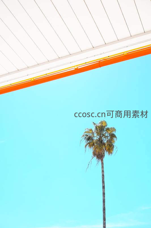 纯净的蓝色天空下,一棵孤独的棕榈树矗立着,其上方是带有鲜明橙色线条的现代建筑屋檐,形成强烈的色彩与几何结构对比。