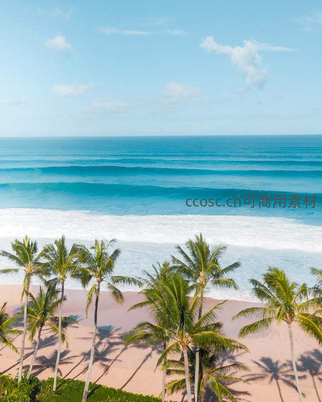 从高处俯瞰,清澈碧蓝的海水拍打着金色沙滩,成排的椰子树在岸边投下长长的影子,远处海浪翻滚,尽显热带海岛的绝美风光。