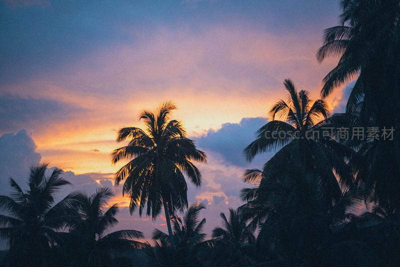 夕阳西下,绚烂的橙紫色晚霞染红天际,几棵高大的椰子树化作深色剪影,构成一幅宁静而浪漫的热带黄昏画卷。