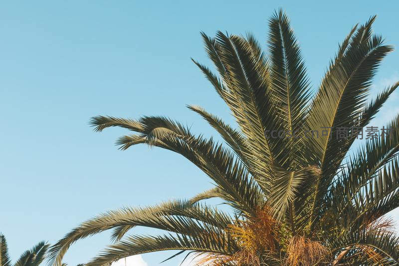 微距特写镜头捕捉了棕榈树叶的精致纹理和翠绿色泽,在纯净蓝天的映衬下,展现出植物旺盛的生命力与自然的清新之美。