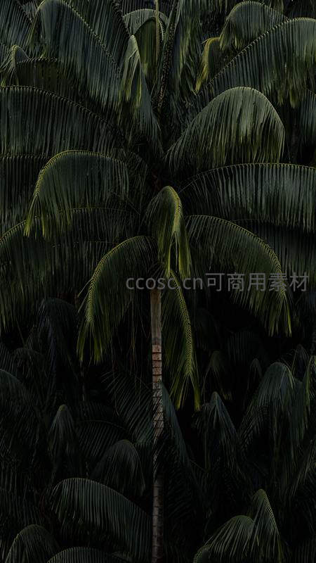 浓密的椰子树叶层层叠叠,深绿色调营造出幽静神秘的丛林感,阳光透过缝隙洒下斑驳光影,生机盎然。