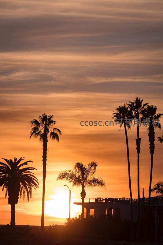夕阳西下棕榈树剪影与建筑轮廓