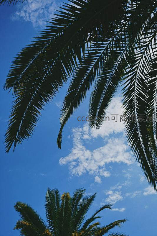 从低角度仰望,深绿色的棕榈叶在纯净的蓝天与朵朵白云映衬下显得格外清晰,微风拂过,叶片仿佛在空中轻柔地舞蹈。