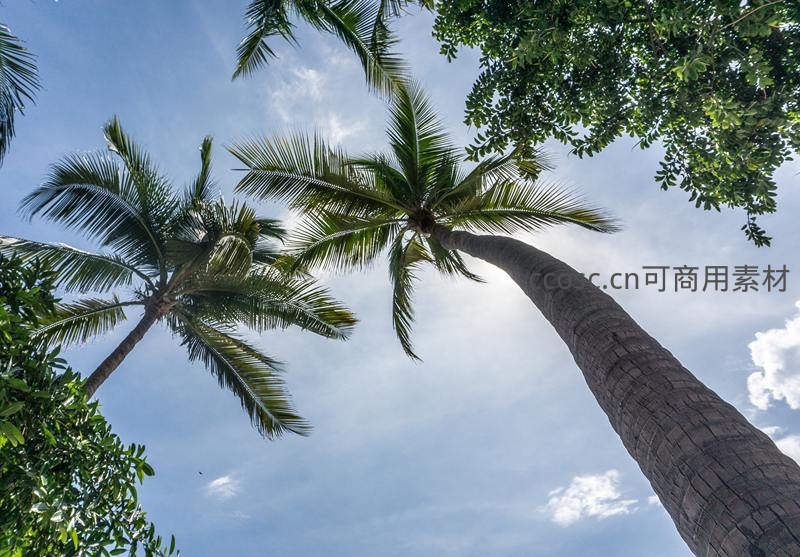 以仰视视角捕捉高耸入云的椰子树,粗壮的树干和繁茂的树冠在蓝天白云下显得雄伟壮观,展现了热带植物的蓬勃生命力。