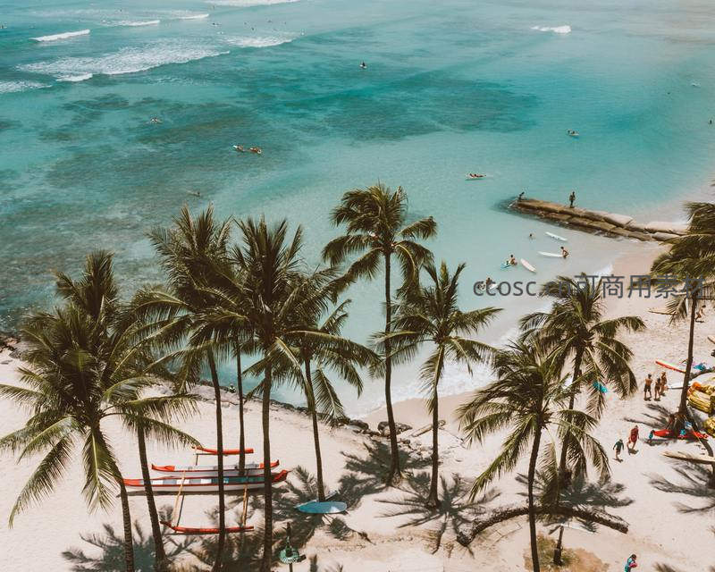高角度俯瞰热闹海滩,椰林环抱白沙,游客或游泳或冲浪,皮划艇停靠岸边,碧海蓝天间洋溢着欢乐与活力的度假气息。