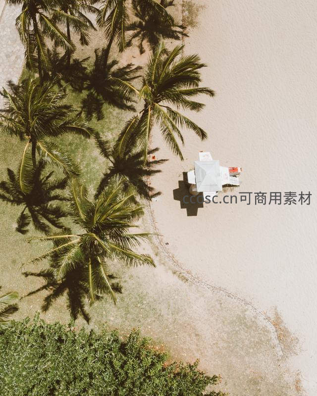 从高空俯瞰,茂密的椰子树在洁白沙滩上投下斑驳阴影,一座白色小屋静立水边,构成一幅宁静的热带海岛画卷。
