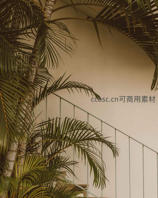 茂盛的棕榈叶在微风中轻拂,与现代感的金属栏杆形成对比,柔和的光线洒在米色墙壁上,营造出宁静而富有设计感的角落。