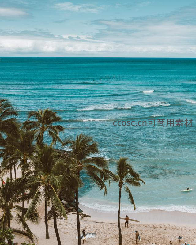 从高处俯瞰,碧蓝的海面上波涛起伏,人们在沙滩上或冲浪或嬉戏,四周环绕的椰林更添一份热带海岛的动感与生机。
