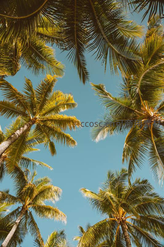 镜头朝天,椰林枝叶在蔚蓝天空下舒展,阳光洒落,营造出开阔、自由、充满热带风情的画面。