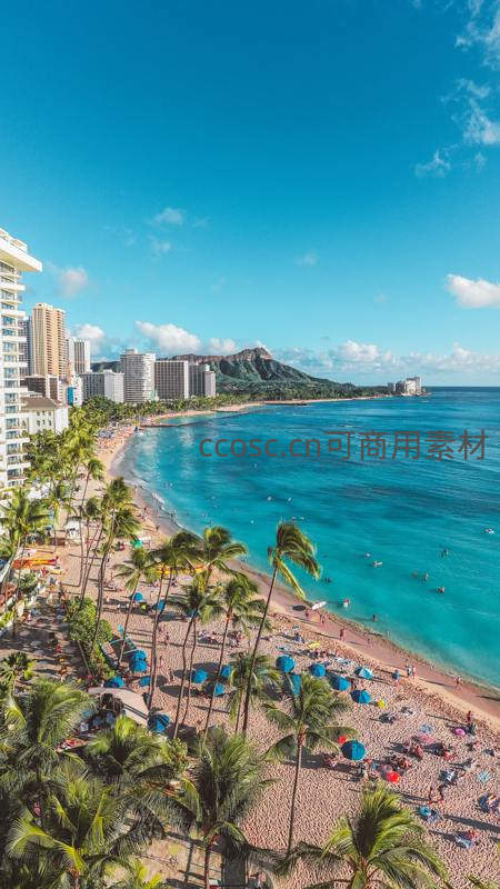 夏威夷威基基海滩全景,椰林与钻石头山相映成趣