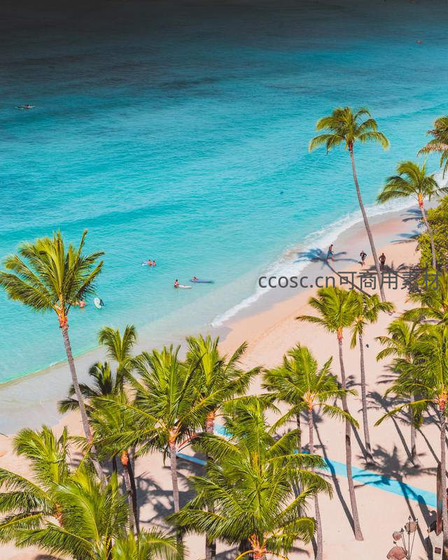 鸟瞰椰林海滩,碧波荡漾人影点点如画