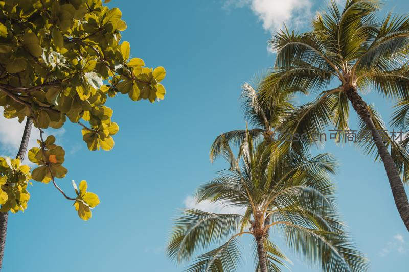 从低角度仰视高耸的椰子树与澄澈蓝天,枝叶婆娑间透出阳光,营造出浓郁的热带海岛氛围,是理想的度假胜地视觉象征。