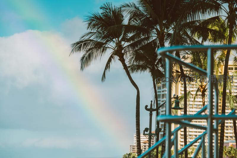 彩虹划过椰林城市,雨后天晴的浪漫瞬间