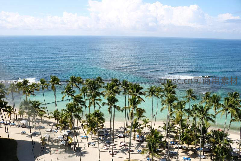高空俯瞰碧海银滩,椰林成排遮阳伞点缀其间