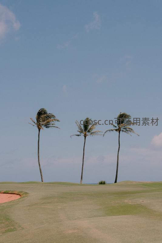 高尔夫球场绿茵之上,三棵椰树迎风挺立如画