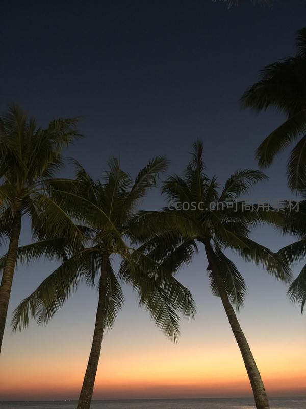 暮色渐浓椰影摇曳,橙紫霞光染透海天一线