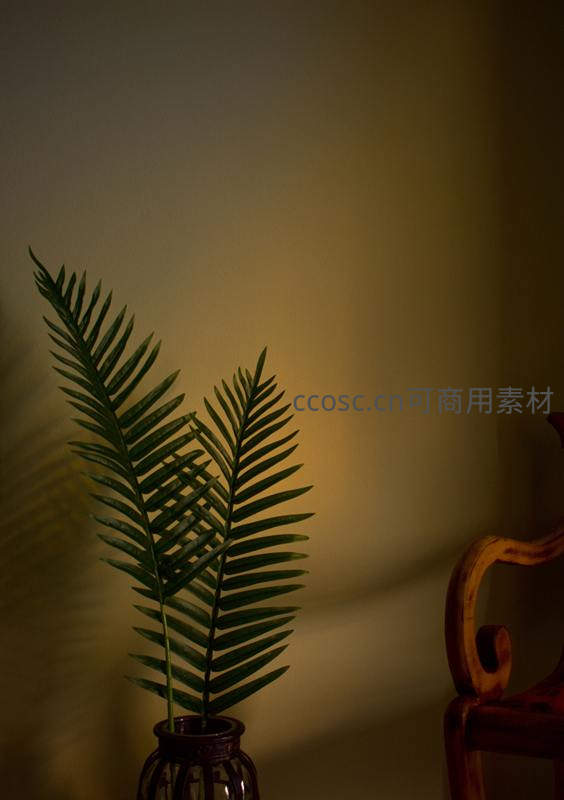 一束翠绿的蕨类叶片插在复古花瓶中,置于温暖灯光下的室内角落,与木质家具相映成趣,营造出宁静舒适的居家氛围。