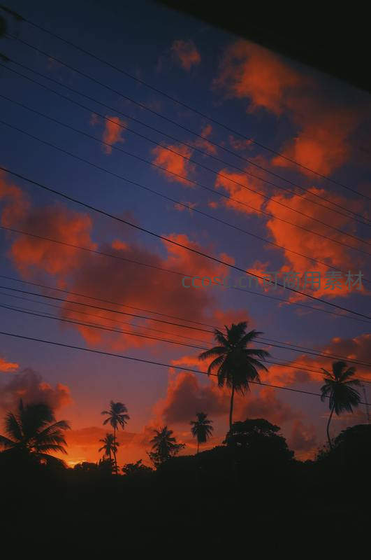 深蓝夜幕与燃烧般的橙红晚霞交织,几棵椰子树在绚烂背景中勾勒出优雅轮廓,横亘的电线为这幅自然画作增添了一丝人间烟火气。