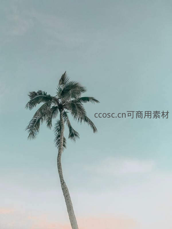 一棵孤高的椰子树静静伫立在淡青色的天空下,画面极简,充满诗意与宁静感,仿佛时间在此刻凝固,只余下风与树的私语。