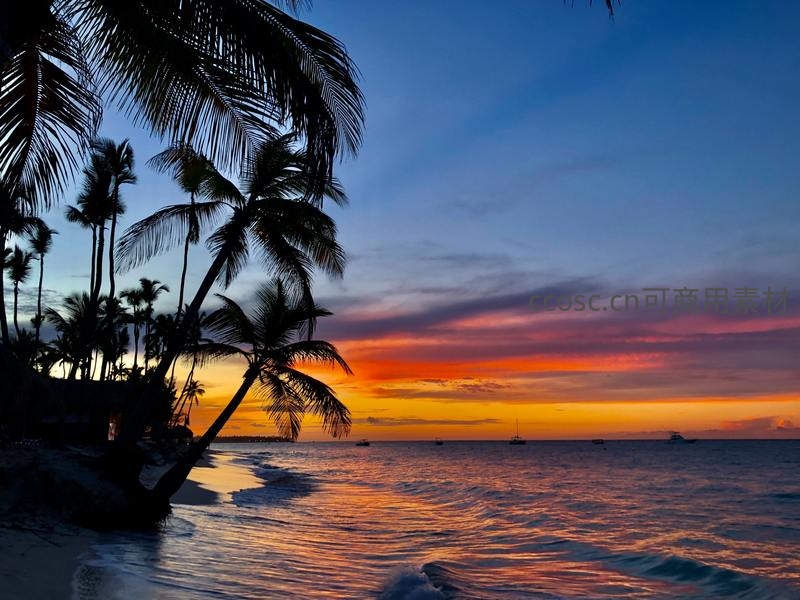 热带海滩上,高大的椰树剪影与绚烂的晚霞交相辉映,海面波光粼粼倒映着橙红天空,营造出宁静而浪漫的黄昏氛围。