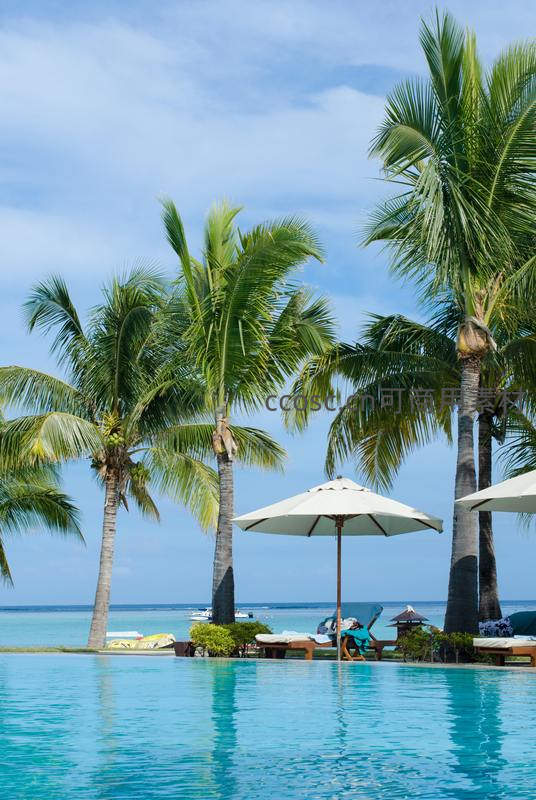 清澈见底的无边泳池与蔚蓝大海无缝衔接,四周环绕着高耸的椰子树和舒适的躺椅,是享受阳光与海风的理想度假胜地。
