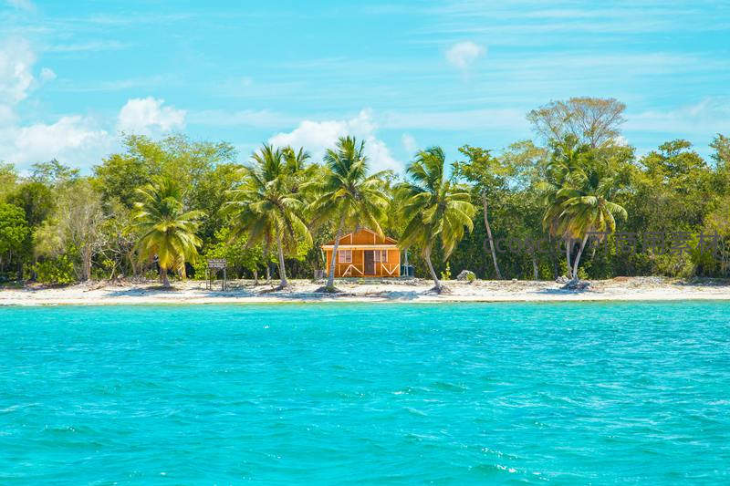 一座温馨的小木屋静卧在郁郁葱葱的椰林之中,前方是清澈见底的碧蓝海水,构成一幅远离尘嚣、充满诗意的海岛田园画卷。