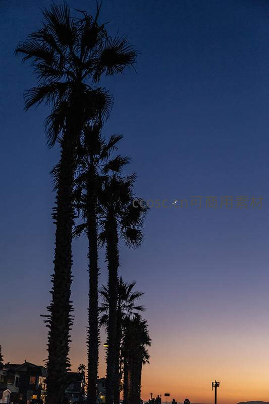 暮色渐浓,几株高大的椰树化作深邃剪影,一弯新月悄然悬于深蓝夜空,远处城市灯火初上,勾勒出宁静而唯美的都市夜景。